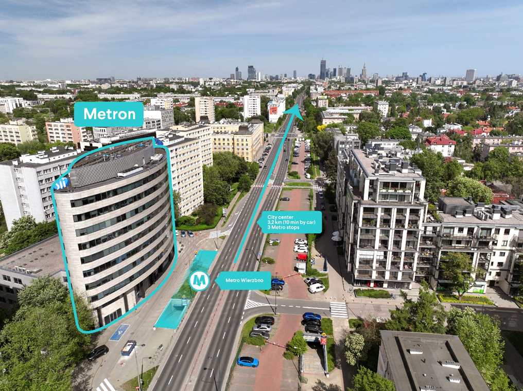 Biurowiec Metron wyróżnia strategiczna lokalizacja przy Alei Niepodległości, kluczowej arterii północ-południe w Warszawie. Dziękim swojemu wyjątkowemu położeniu budynek (nad stacją metra M1 – Stacja Wierzbno) gwarantuje najemcom dogodny (8-minutowy) dojazd do Centrum. Dodatkowym jego atutem jest bliskość istniejących udogodnień w prężnie rozwijającej się dzielnicy Mokotów.
