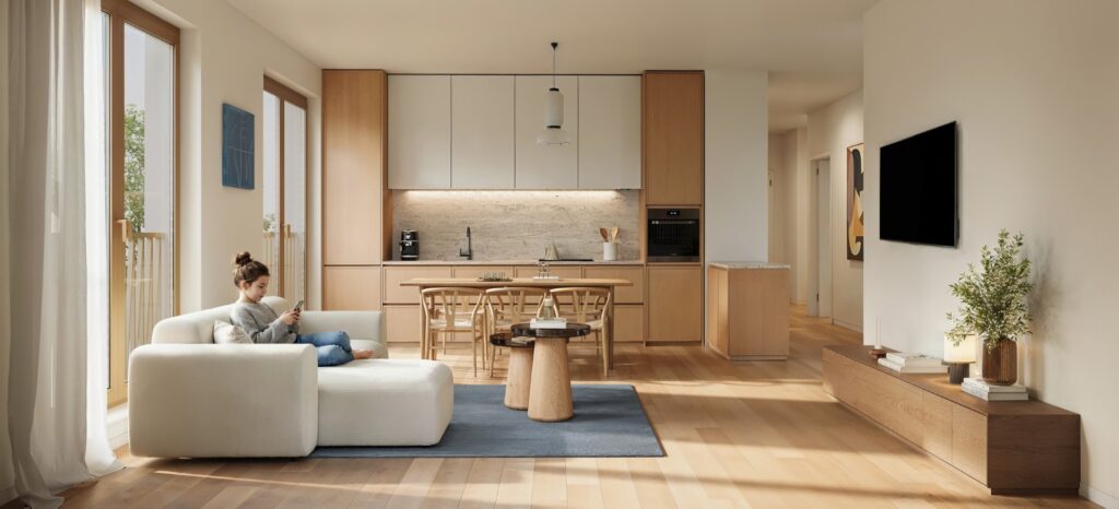 The development provides 156 underground parking spaces and 15 surface-level spaces. Additional amenities include dedicated bicycle storage, loggias, balconies, terraces, and private gardens for ground-floor units. Residents can look forward to a peaceful and comfortable living environment, thanks to the building's high acoustic insulation standards, full air-conditioning pre-installation, and thoughtfully landscaped surroundings.